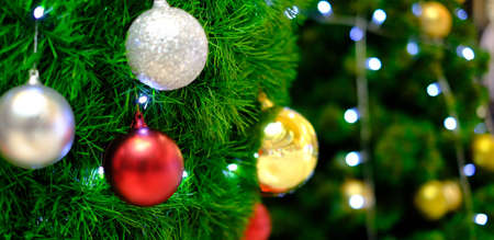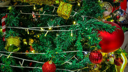 Greeting Season concept.close up of ornaments on a Christmas tree with decorative light