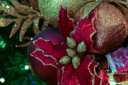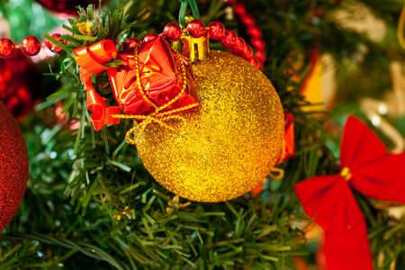 Close up Christmas tree decoration with red ball, gold ball, golden snowflake, red star. Xmas background. Christmas and Happy New Year holiday background.