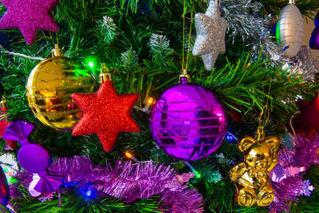 bright background of decorations on the New Year's tree, but the branches of an artificial yalka balls and lights, close-up photo