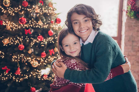 Photo portrait small boy and sister embracing near decorated xmas tree in apartment on winter holidays