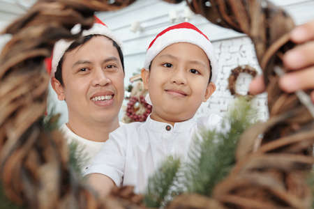 Cheerful father and preteeen son hanging wreath when decorating apartment for CHristmas celebration