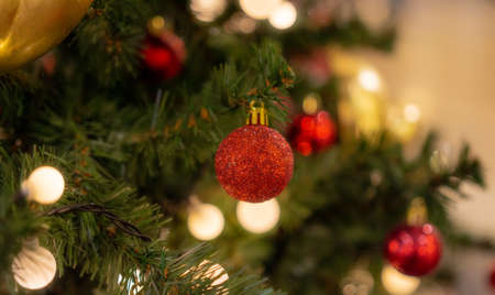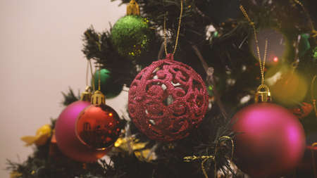 Close up Christmas balls hanging on the branch of the pine with night lighting background. Christmas decorations to celebrate the holiday season