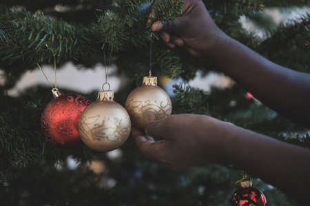 Hands of a colored child hanging golden holiday bauble on Christmas tree. Closeup image.