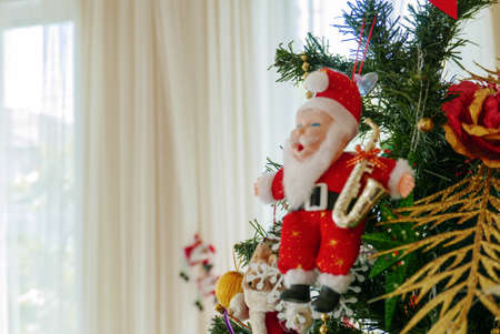 Santa Claus miniature model on Christmas tree nearby window with copyspace for family, giving, season, Christmas, holiday, new year, travel and gathering concept
