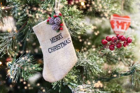 Christmas tree decorated with Christmas stocking toy closeup. Decorated Christmas fir tree.