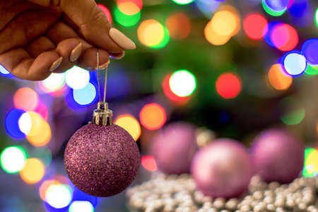 A woman's hand holds a Christmas toy on the background of a Christmas tree with garlands and pink Christmas balls