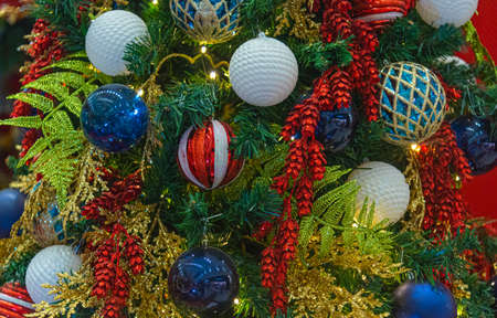 Closeup of Festively Decorated Outdoor Christmas tree with bright balls on blurred background.
