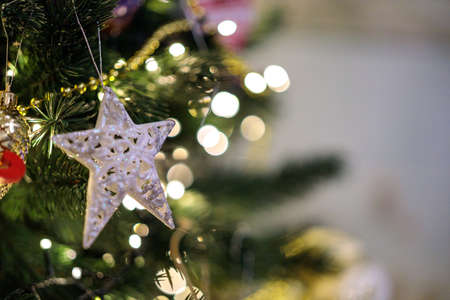 Beautiful Christmas ornaments and decorations hanging in the Christmas tree
