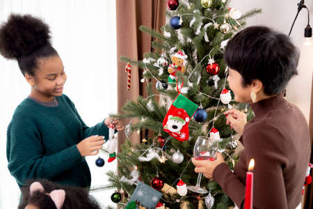 Happy family with mother and daughter decorating ornament on Christmas tree together at home, thanksgiving eve, celebration of woman and child bonding in Christmas day, enjoyment and fun on holiday.