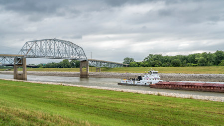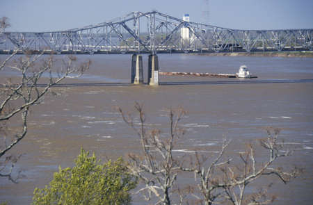 cantilever Cairo Ohio River Bridge in fall scenery with river barges in background, it provides river crossing between Wickliffe, Kentucky and Cairo, Illinois