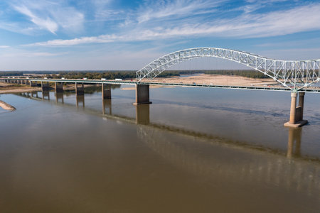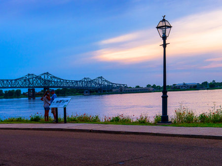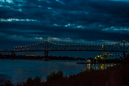 Sunset landscape of the Mississippi River bridge between Mississippi and Louisiana, in Vicksburg, MS.