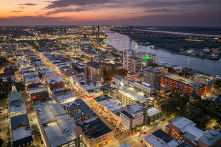 Old historical city Savannah in Georgia. Southern USA cityscape at sunset