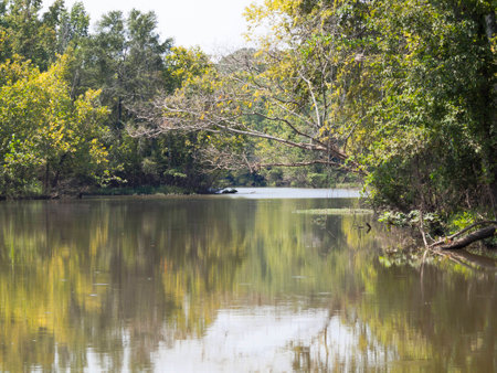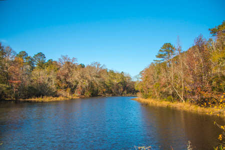 A calm river in rural south Georgia in the Fall on a clear blue sky day