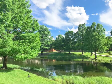 Ducks near pond and water fountain in small American neighborhood