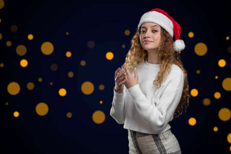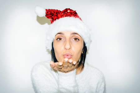 Latin woman celebrating christmas with a santa claus hat, space for text