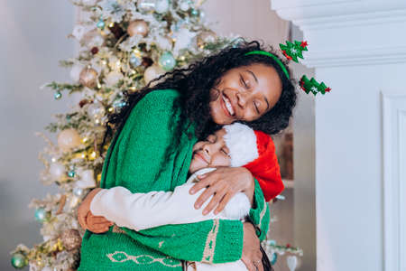 African american mom hugs her little daughter against christmas tree background