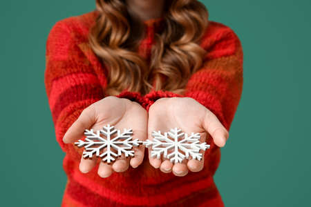 Female hands with snowflakes on green background