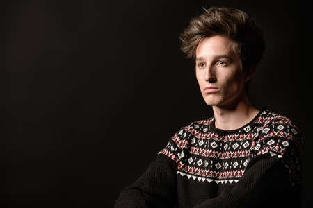 Portrait shot of young male beard model wearing a dark blue colored woolen sweater and posing shot with Rembrandt light technique on his face in black background.