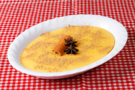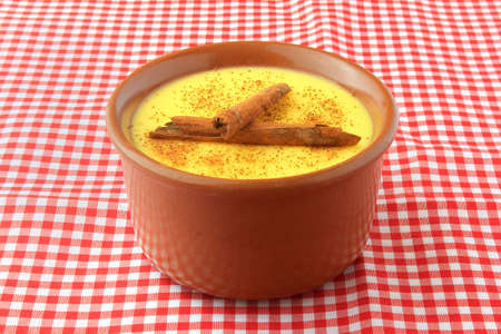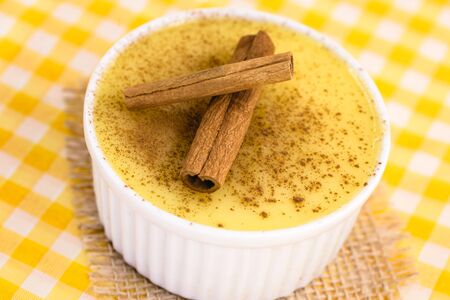 curau, cream of sweet corn and dessert typical of the Brazilian cuisine, with cinnamon placed in a ceramic bowl on a checkered tablecloth. Copy space
