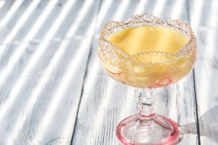 Dish of Creme Brûlée french dessert sprinkled with sugar in a glass bowl on a wood surface