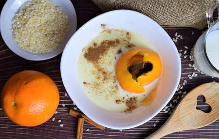 Aerial view homemade rice pudding, with a touch of citrus and cinnamon, in a white porcelain bowl, with the ingredients around