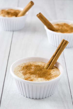 Rice pudding on white wood