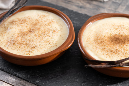 Traditional spanish natilla dessert sprinkled with cinammon.