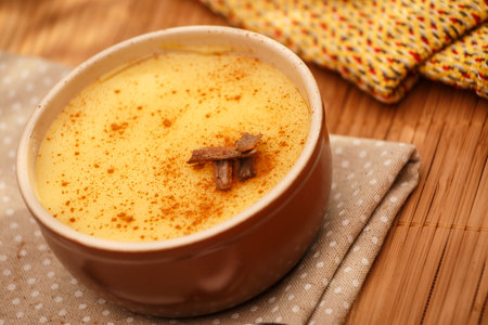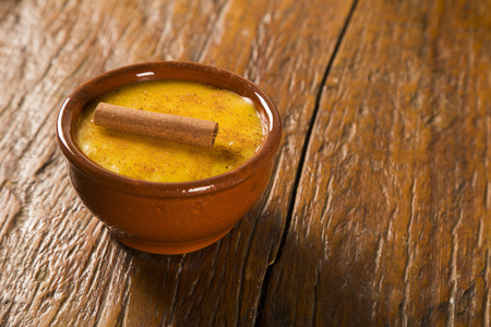 Curau, cream of corn sweet and dessert typical of the Brazilian cuisine, with cinnamon placed in ceramic bowl on wooden table. Copy space. Close-up