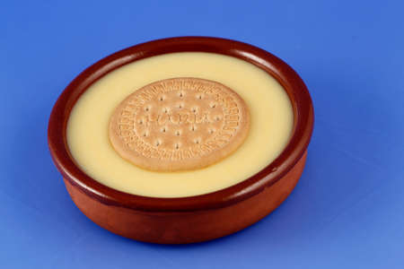 Vanilla custard with homemade cookie. Minimalist blue and yellow background