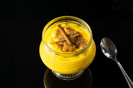 Brazilian sweet custard-like dessert curau de milho mousse of corn with cinnamon. Selective focus