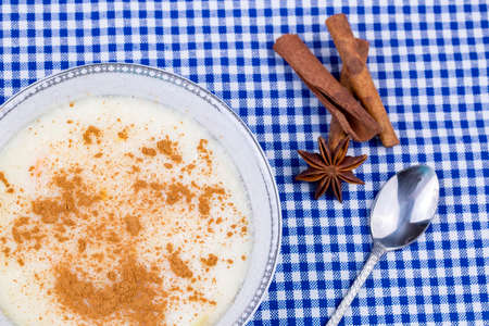 Rice pudding and cinnamon on a wooden base