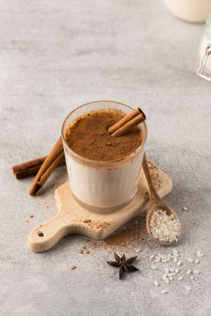 Eggnog with cinnamon and nutmeg for Christmas and winter holidays. Homemade eggnog in glasses with spicy rim. Top view, copy space.