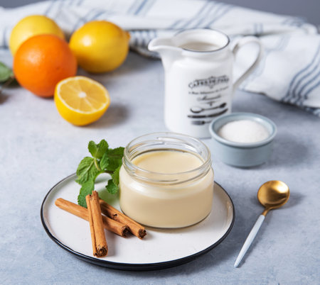 Delicious panna cotta or vanilla pudding with citrus fruits in a jar on a light background with ingredients. Homemade healthy sweet food.
