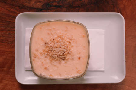 Curau, cream of corn sweet and dessert typical of the Brazilian cuisine, placed in ceramic bowl on wooden table. Close up