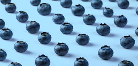 Fresh blueberries are evenly placed on a clean white surface. The arrangement showcases their round shape and deep blue color, highlighting their natural beauty and freshness.