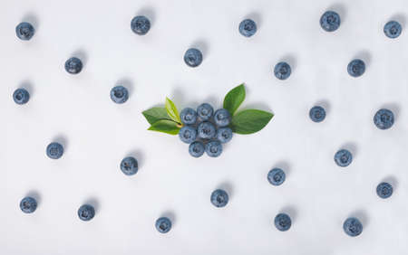 flat lay of blueberry with green leaves over white background, concept healthy eating and nutrition