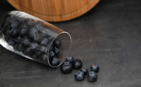 Fresh blueberries in a glass bowl. Delicious blueberries scattered from a glass cup. Gray background in the background is a wooden board. Place for tex