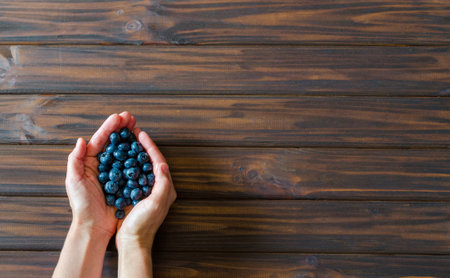 Woman hands with blueberries on dark wooden desk background. Flat lay. Top view. Backdrop.