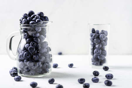 Blueberries in a glass jug on a white background. The benefits of berries, vegetarianism concept.