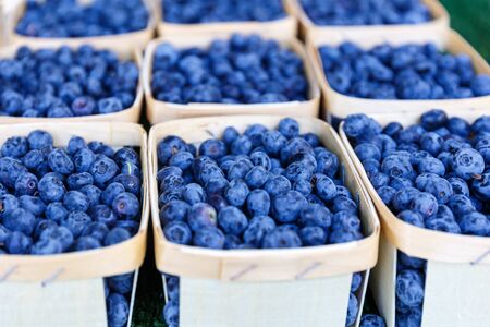 Freshly picked blueberries are in a wooden box. Healthy food, health
