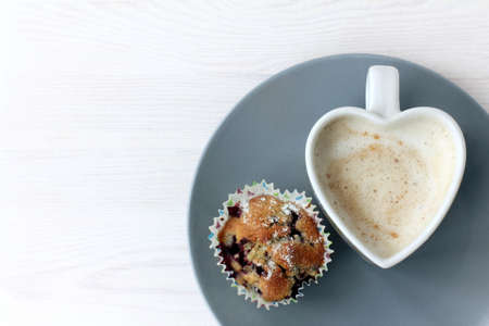 berry muffin and a mug with a frothy cappuccino in the shape of a heart on a plate top view / little sweet love