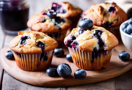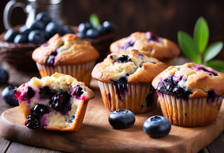Close-up of delicious homemade blueberry muffins with fresh berries on rustic wood