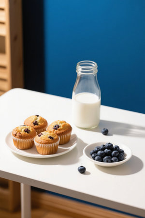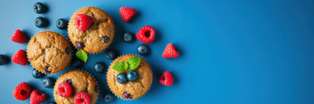 Freshly baked muffins with berries on a vibrant blue background showcasing a delightful breakfast treat