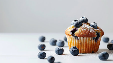 Freshly baked blueberry muffins decorated with powdered sugar and fresh blueberries, creating a tempting treat