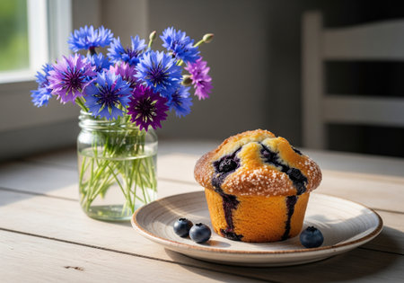 Homemade blueberry muffin on a plate with a bouquet of cornflowers in a glass jar in sunlight. A cozy and delicious breakfast still life.