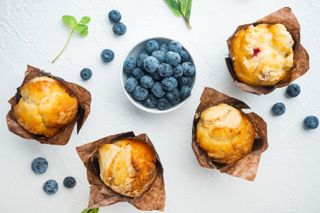 Blueberry Muffins Vegetarian Dessert On White Background, Top View