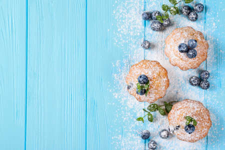 Homemade baked muffin with blueberries, fresh berries, mint, powdered sugar on blue wooden background. Top view. Delicious dessert. Fruit cupcake. Bakery banner, flyer, card. Empty space for text.