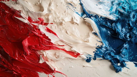 Vivid strokes of red, white, and blue paint intertwine on canvas, capturing the essence of creativity and artistic expression. The vibrant textures evoke emotion and movement.