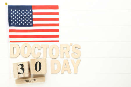 Text Doctor's Day with cube calendar and american flag on white wooden table