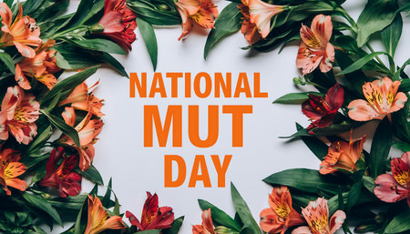 A colorful floral arrangement surrounds the text National Mut Day.